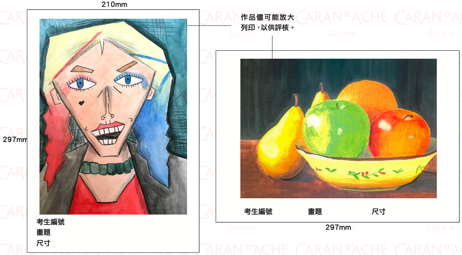 作品的形式不限,平面绘画至立体创作皆可;所有作品均需由考生独自制作完成,不容许代画或经由其他人修改; 如有上述违规情况出现,评分委员会有权扣减分数;若违规情况极严重,考生可被罚取消有关科目或全部科目的考 试成绩。